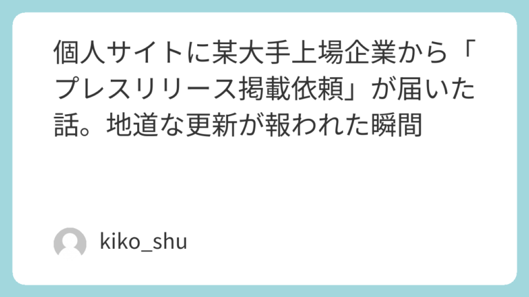 2025-12-11 Eatransform 個人サイトに某大手上場企業から「プレスリリース掲載依頼」が届いた話。地道な更新が報われた瞬間 ITフリーランスとして日々コードを書いたり、システムの開発に... 続きを読む